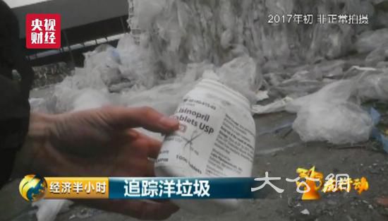 2017年初,记者在天津市滨海新区四道桥附近看到,这个货场里堆放着至少有上千吨废旧塑料,地面上还散落着写有英文字母的药瓶和饮料瓶。