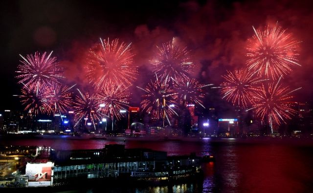 香港举行烟花汇演庆祝中华人民共和国成立68周年(2017年10月1日摄)。新华社记者秦晴摄