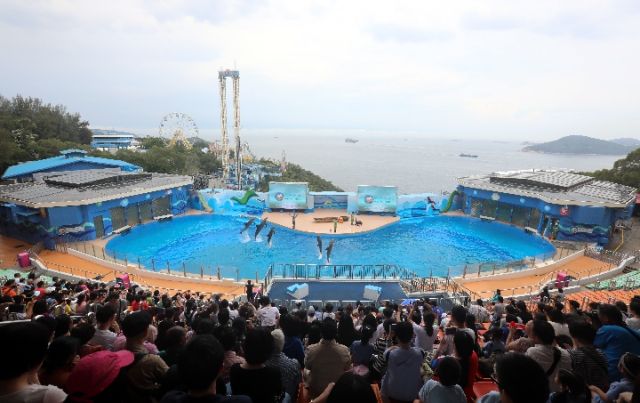 游客在香港海洋公园观看表演(5月8日摄)。新华社记者李鹏摄