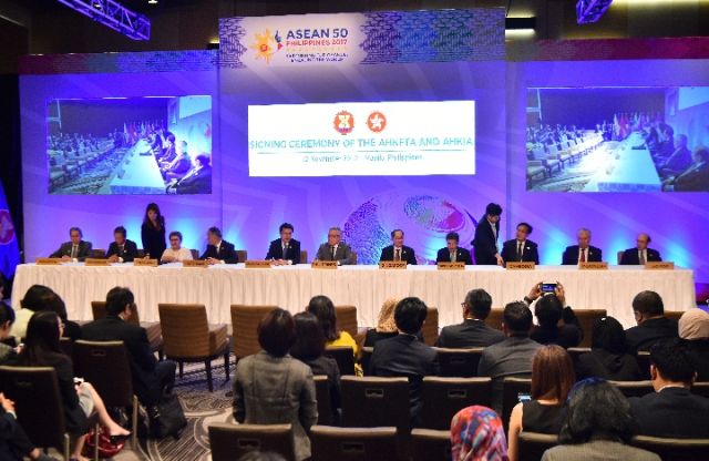 在菲律宾马尼拉,中国香港特别行政区政府与东盟签署自由贸易协定与相关投资协定(2017年11月12日摄)。新华社发(王玺摄)