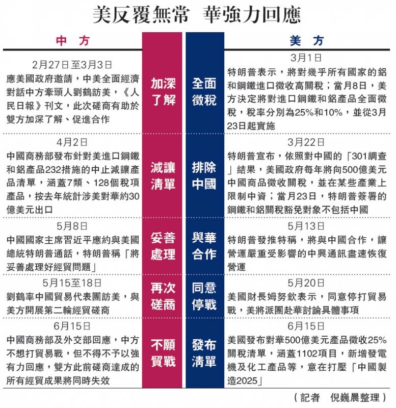 经过梳理後不难发现,面对贸易摩擦中国更多表现出坦诚、合作,但无惧挑衅的态度。事实上,今年2月末至3月初,中美全面经济对话中方牵头人刘鹤就应美国政府邀请访美,当时《人民日报》刊文,此次磋商有助於双方加深了解、促进合作。不过,面对刘鹤访美期间所释放的善意,美国却视而不见。特朗普3月1日表示,将对几乎所有国家的铝和钢铁进口徵收高关税,当月8日,特朗普又签署命令,决定将对进口钢铁和铝产品全面徵税,税率分别为25%和10%,并从3月23日起实施。