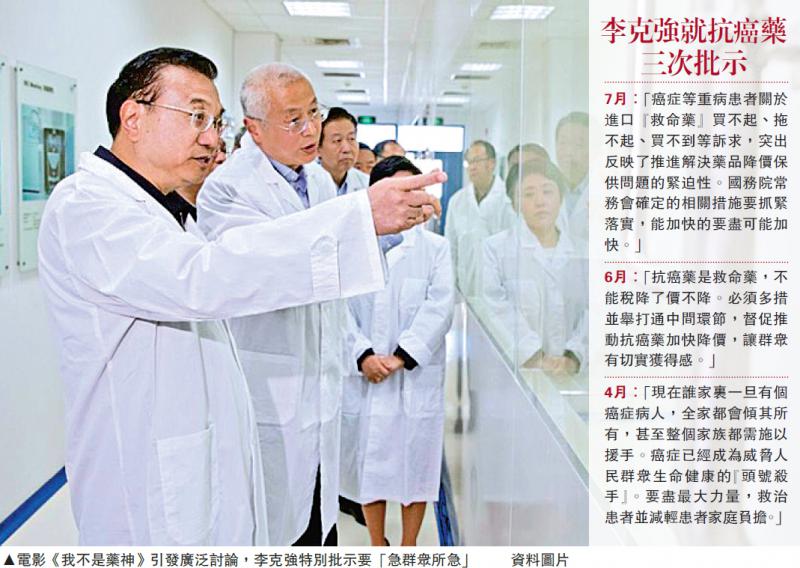 近期票房火爆的“现象级”电影《我不是药神》引发各界对内地抗癌药物价格过高等问题关注。面对民间呼声,中央高层给出积极回应。中国政府网18日报道,李克强总理就此批示,“癌症等重病患者关於进口‘救命药’买不起、拖不起、买不到等诉求,突出反映了推进解决药品降价保供问题的紧迫性。”“国务院常务会确定的相关措施要抓紧落实,能加快的要尽可能加快。”