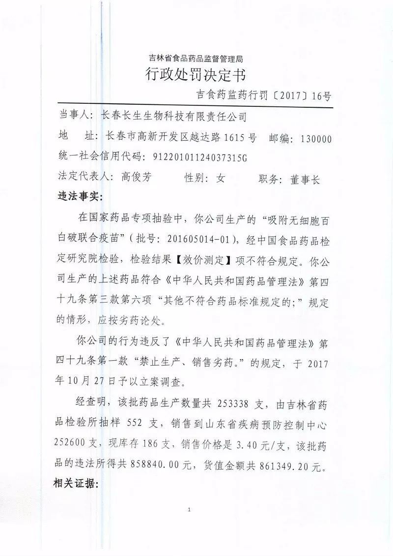 7月20日,吉林省食药监局的一纸行政处罚公示,彻底将公众的早已郁积多日的愤怒情绪引爆:长春长生生产的“吸附无细胞白百破联合疫苗”(批号:201605014-01)经中国食品药品检定研究院检验,检验结果【效价测定】项不符合规定,按劣药论处。这条处罚信息,针对的是2017年11月的一起违法事件。由长春长生生物科技有限公司和武汉生物制品研究所有限责任公司生产的各一批次共计65万余支百白破疫苗效价指标不符合标准规定,食药监总局已责令企业查明流向,并要求立即停止使用不合格产品。经检查,长春长生生物科技有限公司生产的批号为201605014-01的疫苗共计252600支,全部销往山东省疾病预防控制中心;武汉生物制品研究所有限责任公司生产的批号为201607050-2的疫苗共计400520支,销往重庆市疾病预防控制中心190520支,销往河北省疾病预防控制中心210000支。