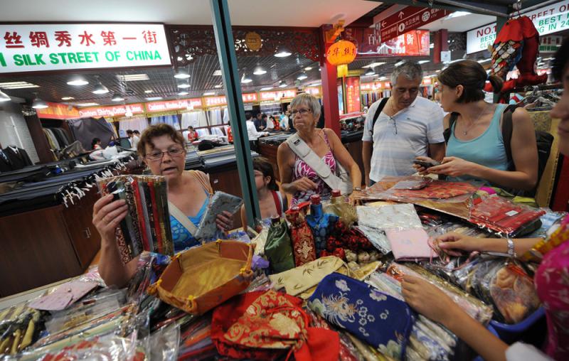 图:秀水街上见证了改革开放后的中国如何一步步地走向世界。图为外国游客在北京秀水街购物\资料图片