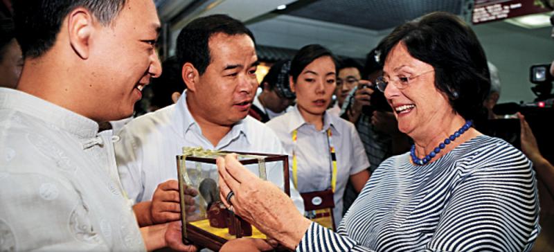 图:2008年时任国际奥委会主席罗格夫人逛秀水街\受访者供图