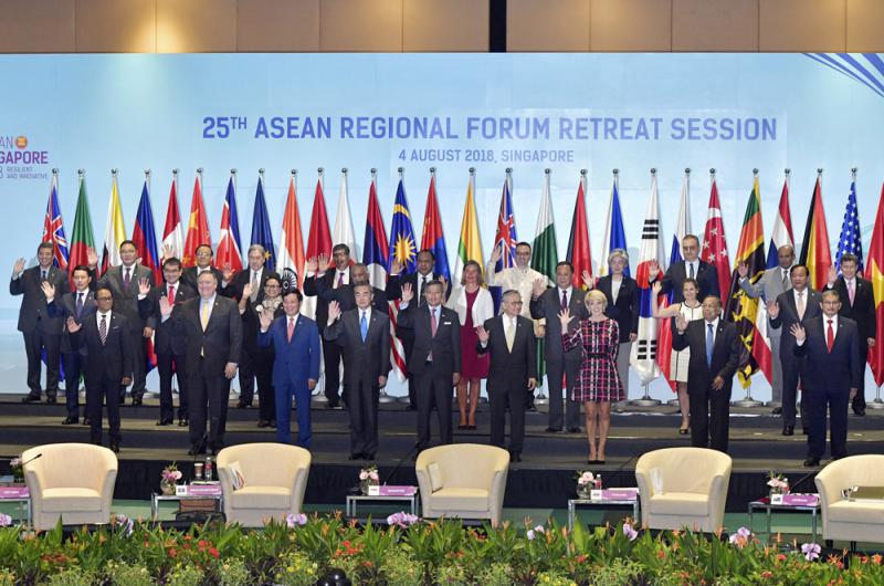 图:4日,中国国务委员兼外交部长王毅出席在新加坡举行的第25届东盟地区论坛外长会。图为与会代表合影\美联社