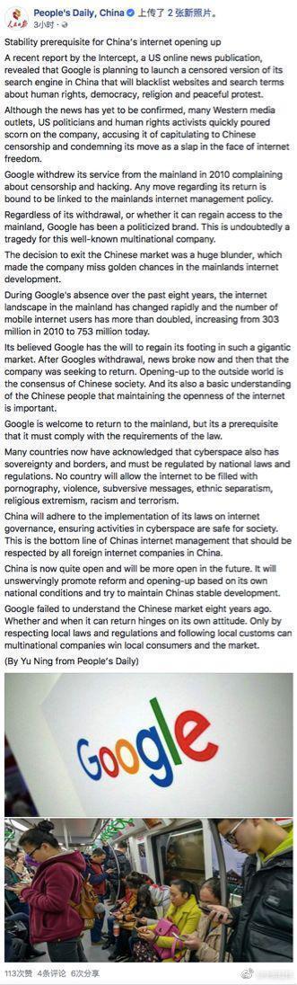 昨日,@人民日报在Twitter和Facebook上刊文,针对上周传出的谷歌计划重返中国大陆的消息回应称,欢迎谷歌重返中国大陆,但前提是必须遵守中国法律。人民日报指出,谷歌在2010年撤出中国大陆的搜索引擎服务这一决定是一个“巨大的失误”。