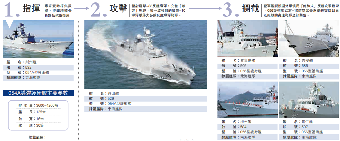 接受考验的全部“近海狼群”的056型导弹护卫舰(含056A型)。公开资料显示,最大排水量近1300余吨的056护卫舰被编入专门承担近海防御任务的护卫舰支队。