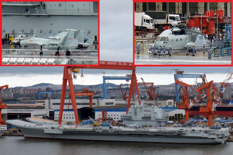 图:歼-15、直-9(左上小图)、直-18(右上小图)三架舰载机首次同时亮相国产航母/大公报记者宋伟摄