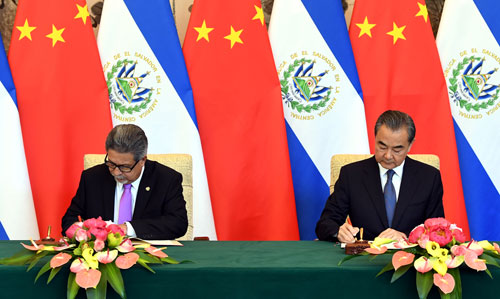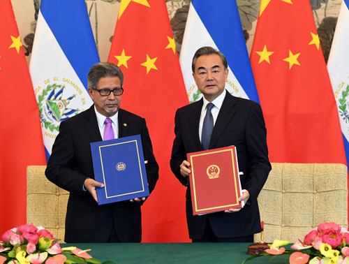 2018年8月21日上午,国务委员兼外交部长王毅在北京同萨尔瓦多外长卡斯塔内达签署两国关于建立外交关系的联合公报。
