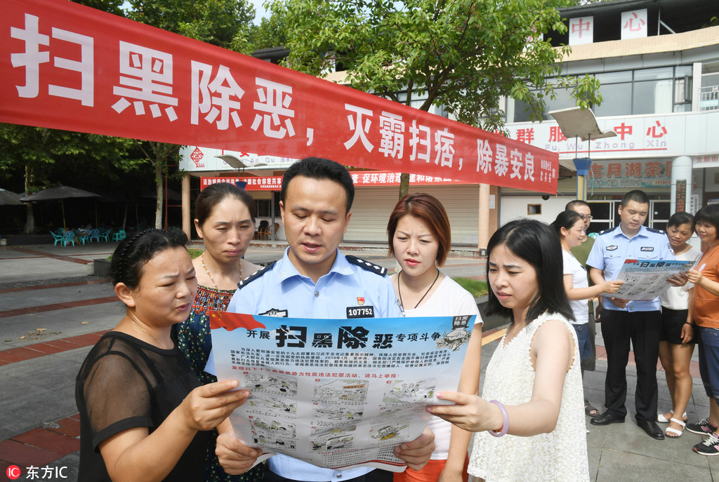 资料图:四川省广安市广安区公安分局民警向湖滨路社区居民宣传扫黑除恶知识(图来自东方IC)