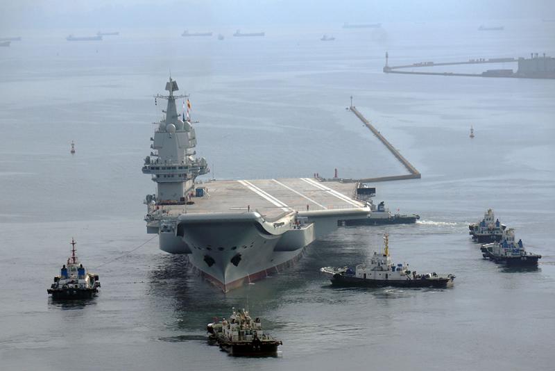 图:26日,国产航母开展第二次海试。图为航母正在“倒车”驶离泊位 大公报记者宋伟摄