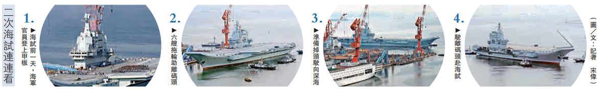 七时四十五分许,大连造船厂内响起鞭炮和礼炮声,欢送国产航母进行第二次海试。航母亦升起国旗,并挂出代表“本船将要出海,所有人员立即回船”的海事信号旗。五分钟后,拖船开始拖曳,航母倒车退出码头,并改挂代表“我正在海试”的信号旗。八时三十分许,国产航母在拖轮辅助下完成调头,转向驶往海试区域。
