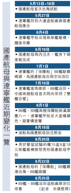 记者次日看到,自早7时起即有工作人员巡视国产航母甲板,且所有舰载武器均撤下防雨布包裹。当日9时30分,原本离开码头的海军89号综合保障船(89舰),悬挂代表“我船上有引航员”的海事信号旗,返航驶回原泊位,早前随89舰一起离开的88舰也一同返港。两舰短暂离港可能是为了更替参加航母训练人员并补给物资。