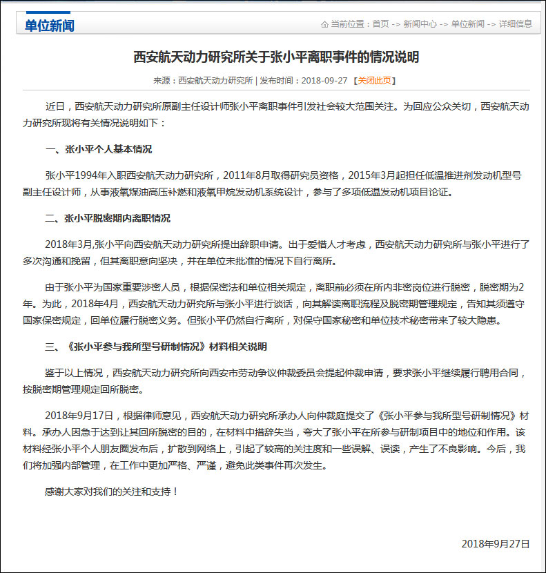 2018年9月17日,根据律师意见,西安航天动力研究所承办人向仲裁庭提交了《张小平参与我所型号研制情况》材料。承办人因急于达到让其回所脱密的目的,在材料中措辞失当,夸大了张小平在所参与研制项目中的地位和作用。该材料经张小平个人朋友圈发布后,扩散到网络上,引起了较高的关注度和一些误解、误读,产生了不良影响。今后,我们将加强内部管理,在工作中更加严格、严谨,避免此类事件再次发生。