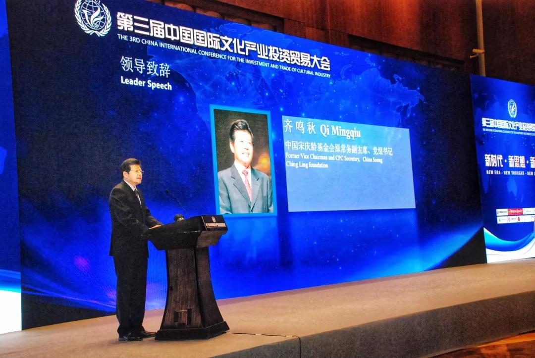 中国宋庆龄基金会原常务副主席、党组书记齐鸣秋在致词中指出改革开放已经走过了四十个年头,中国的经济崛起催生了文化产业的复兴,一个辽阔的文化产业蓝海已经展现在了我们面前,新的商业业态、文化业态、产业业态正在孕育而出。中国的文化产业发展期待着海内外的金融、文化、商贸等行业跨界合作、融合共赢。