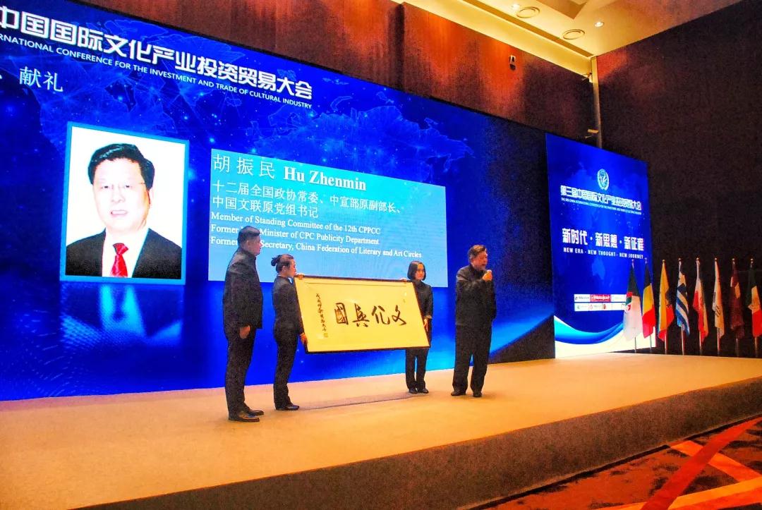 十二届全国政协常委、中宣部原副部长、中国文联原党组书记胡振民向大会秘书处北京国际文化贸易促进会赠送了亲笔题写的“文化兴国”,对文投大会的举办表示热烈祝贺。