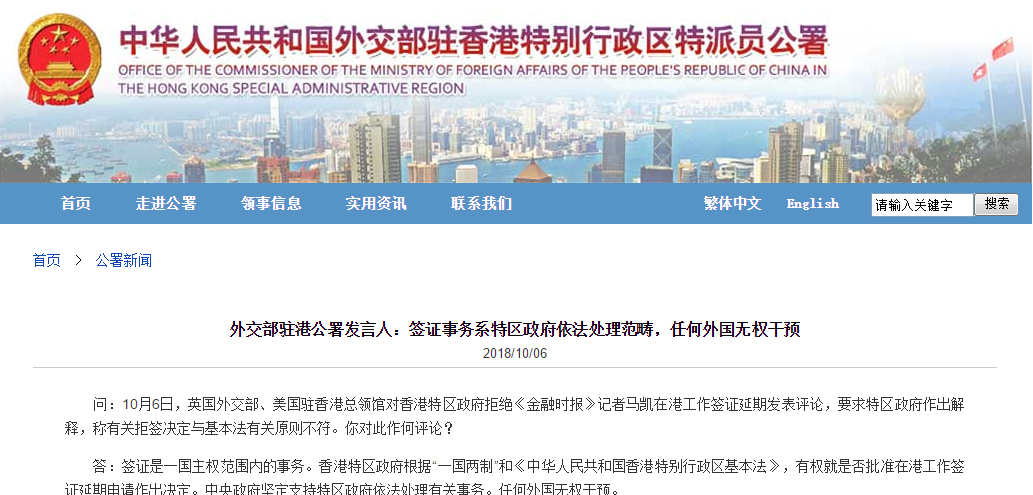 答:签证是一国主权范围内的事务。香港特区政府根据“一国两制”和《中华人民共和国香港特别行政区基本法》,有权就是否批准在港工作签证延期申请作出决定。中央政府坚定支持特区政府依法处理有关事务。任何外国无权干预。