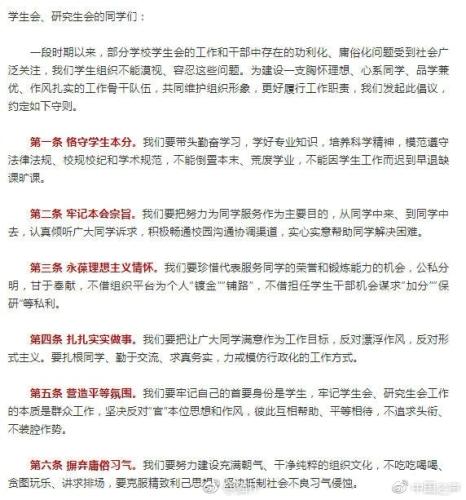 针对接连发生的多起学生组织功利化、庸俗化问题,北大清华等数十所高校学生会、研究生会6号联合发起“学生干部自律公约”。公约发出六点倡议,呼吁恪守学生本分,不能倒置本末,牢记学生会、研究生会工作的本质是群众工作,坚决反对“官”本位思想和作风。要克服精致利己思想,坚决抵制社会不良习气侵蚀。