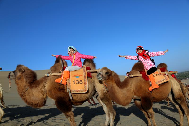 图:10月3日,游客在甘肃省敦煌市鸣沙山月牙泉景区游玩\新华社