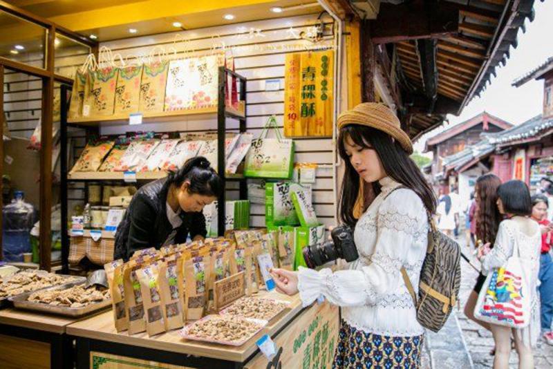 图:如今游客在内地旅游,手信可透过网上下单直接快递回家。图为游客在挑选手信\资料图片