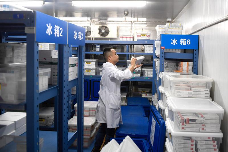 图:10日,工作人员在浙江大学医学院附属第二医院的药品仓库取药\新华社