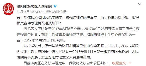 河南省洛阳市洛龙区法院官方微博10月16日消息,关于媒体报道洛阳师范学院学生被强送精神病院治疗一事,我院高度重视,现将相关案件办理情况通报如下: