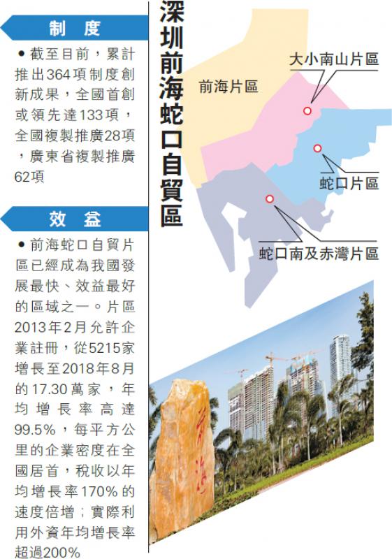 系列制度创新也为前海带来良好的发展效益。数据显示,前海蛇口自贸片区已经成为我国发展最快、效益最好的区域之一。片区2013年2月允许企业注册,从5215家增长至2018年8月的17.30万家,年均增长率高达99.5%,每平方公里的企业密度在全国居首。前海片区自有统计数据以来,税收以年均增长率170%的速度倍增;实际利用外资年均增长率超过200%,其中实际利用港资年均增长率达到206%;固定资产投资年均增长率达到84%。