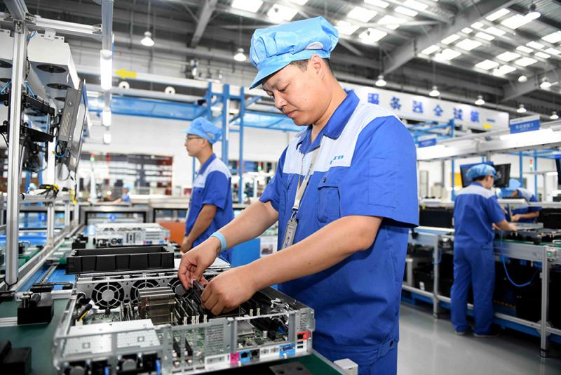 图:在位於山东济南高新区的浪潮集团高端容错计算机生产基地,员工在组装浪潮服务器 资料图片