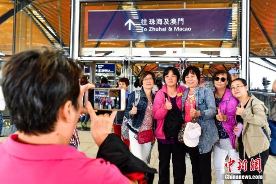 旅客在港珠澳大桥珠海公路口岸旅检楼拍照留念。中新社记者 陈骥旻 摄