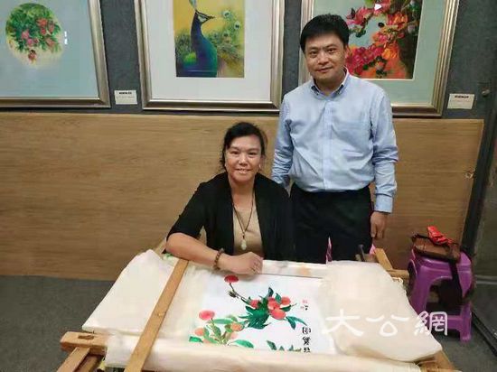广绣传承人黄敏健(左)及丈夫谭展鹏。(卢静怡摄)
