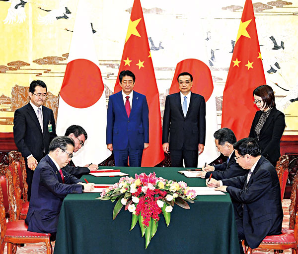 图:26日,国务院总理李克强同日本首相安倍晋三会谈后,共同见证双方政治、创新、金融、海关、体育等领域10余项政府间合作协议的签署 新华社