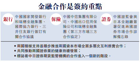 金融合作是此次签约的重点,国务院总理李克强说,中国将进一步扩大新一轮对外开放,推进更加公正的监管,更加严格保护知识产权,营造市场化、法治化、国际化的营商环境。欢迎包括日本在内的各国企业来华投资兴业。我们愿意通过本币互换等加强与日本的金融合作,为双方企业合作提供有力支撑。