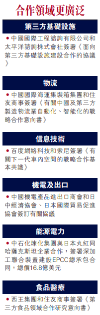 国际资政智库主任王首伟告诉大公报说,中日银行、保险与证券等金融机构合作是一个亮点。中日开拓第三方市场,双方作为资本输出国,加强在投资风险、资本收益、合规风险、风险预防、风险管理等层面合作,可以实现优势互补、互利共赢。在第三方开展基础设施建设与能源开发投资建设项目合作,也是这次中日合作协议的重要部分。