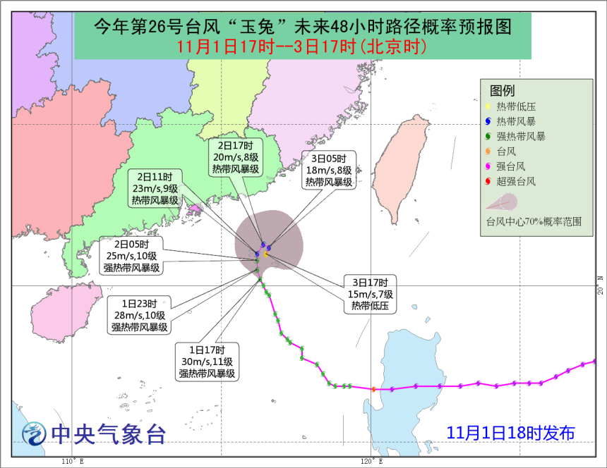 11月1日20时到11月2日20时,受“玉兔”和冷空气共同影响,台湾以东洋面、巴士海峡、台湾沿海将有7-8级大风,阵风9-10级;台湾海峡、福建沿海、广东东部沿海、南海东北部将有8-10级大风,阵风11-12级。