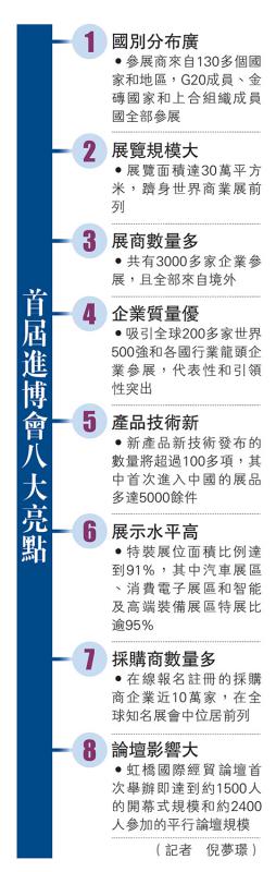 据介绍,首届进口博览会的国家贸易投资综合展共有82个国家和世贸组织、联合国工发组织、国际贸易中心等国际组织参展。企业商业展吸引了130多个国家和地区的3000多家企业参展,展览规模大、国别分布广、企业质量优、新产品新技术多、展览展示水平高。展会期间,将举办200场左右形式多样、内容丰富、主题鲜明的各类配套活动。