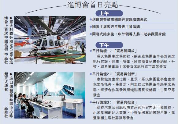 今日开幕的进博会是世界上第一个以进口为主题的大型国家级展会,来自130多个国家和地区的超过3000家企业在这里集中展示其前沿产品,逾5000种展品将在此实现中国首秀,超过15万中外采购商将到会洽谈采购。来自130多个国家的政要和有关国际组织负责人、全球商界领袖、知名专家学者以及国内各部委、各地方约1500名代表将出席今日的开幕式。香港行政长官林郑月娥也已于昨日到达上海,并将于今日出席进博会开幕式以及虹桥经贸论坛活动。
