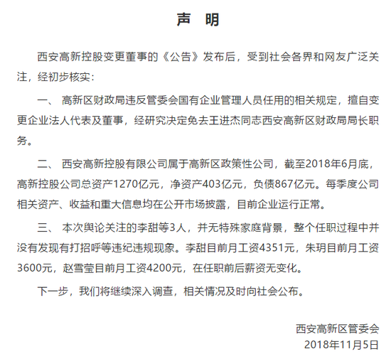 11月4日和11月5日凌晨,西安高新官方微信号连续发布两条声明:李甜等三人被停职;高新区财政局违反国企管理人员任用规定,擅自变更企业法人代表及董事,局长王进杰被免职。