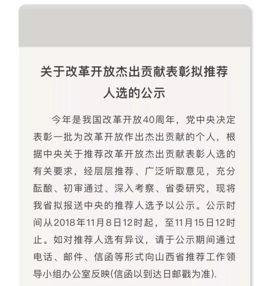 原标题:关于改革开放杰出贡献表彰拟推荐人选的公示