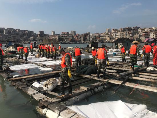 昨天下午,记者实地走访污染海域,空气中依旧散发着轻微的气味,渔排养殖区内渔排的清污、加固等工作还在进行中,在受损较严重的渔排区,现场工作人员正把网箱内的污染物进行清理。由于海水流动造成残留的油污继续漂浮扩散,工作人员持续不断地更换吸油毡,现场也有货车陆续运进吸油毡。