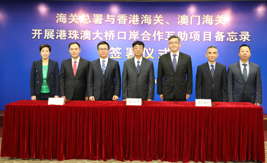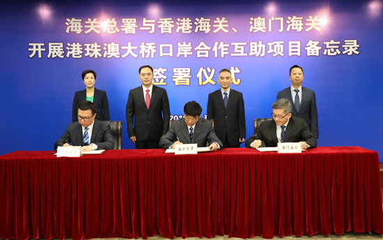 国家海关总署广东分署主任李书玉(前排中)、香港海关关长邓以海(前排左)和澳门海关关长黄有力(前排右)签署海关总署与香港海关、澳门海关开展港珠澳大桥口岸合作互助备忘录
