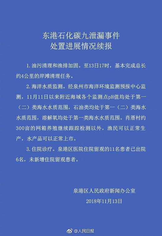 13日,泉港区人民政府新闻办公室发布东港石化碳九泄漏事件处置进展情况续报。续报称:①基本完成总长约4公里的岸滩清理任务;②肖厝村约300亩的网箱养殖继续跟踪检测以外,渔民可以正常生产,水产品可以正常上市;③11名患者已出院6名,未新增住院患者。