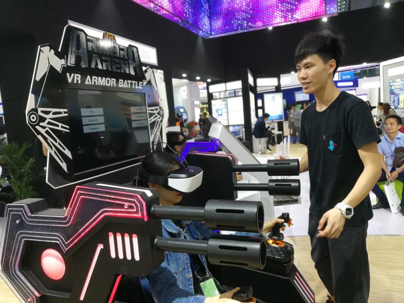 图:一家香港企业展出动感影院和虚拟现实设备/ 记者黄仰鹏摄