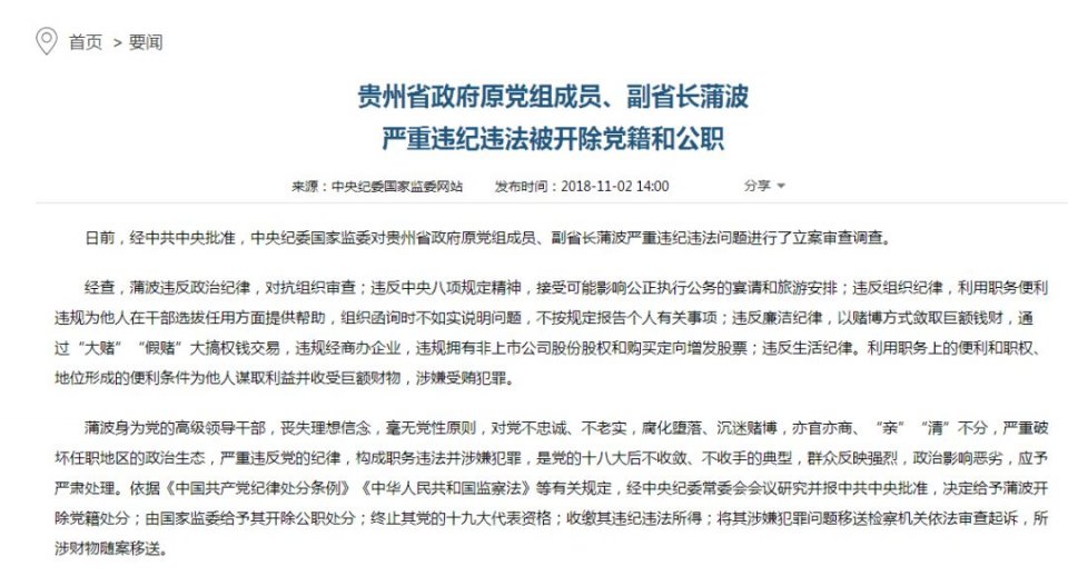 在王晓光落马一个月后,5月4日,贵州省原副省长蒲波落马,官方通报称,蒲波“违规经商办企业,违规拥有非上市公司股份股权和购买定向增发股票”。