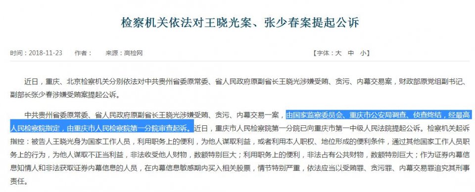 政知君注意到,与双开通报和决定逮捕时不同,本次被公诉时,王晓光涉嫌的罪名增加了一个——在受贿罪、贪污罪的基础上,增加了内幕交易罪。