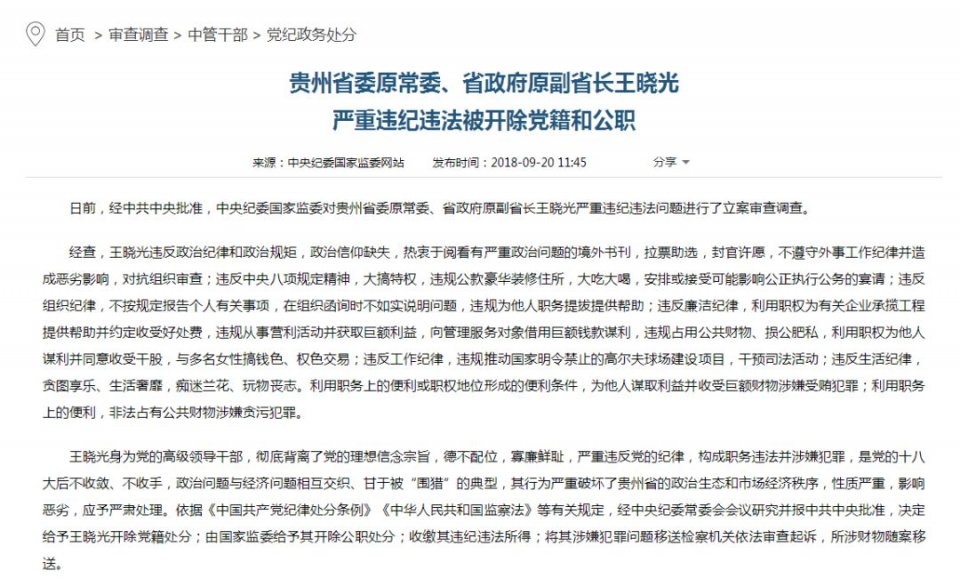 国家监察委留置第一案——贵州省委原常委、副省长王晓光案相关文书