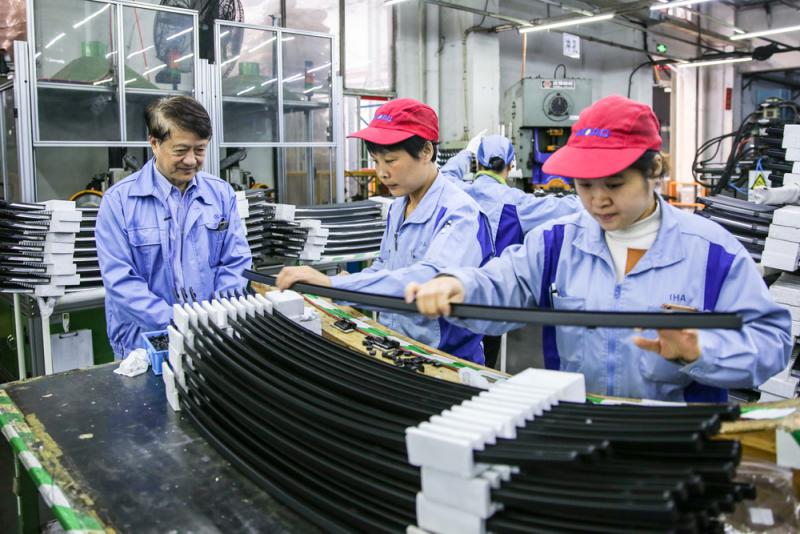 图:30年前创业的民营企业家、无锡市华光轿车部件集团有限公司董事长薄铸栋(左一)在生产车间查看生产情况/新华社