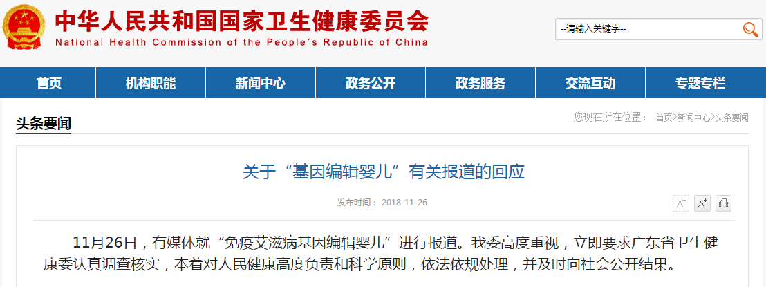 国家卫健委26日晚间发布公告称:11月26日,有媒体就“免疫艾滋病基因编辑婴儿”进行报道。国家卫健委高度重视,立即要求广东省卫生健康委认真调查核实,本着对人民健康高度负责和科学原则,依法依规处理,并及时向社会公开结果。