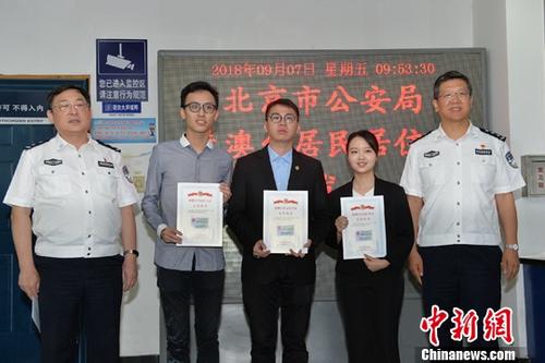 9月7日,北京市公安局在朝阳公安分局呼家楼派出所举行港澳台居民居住证首发仪式。来自台湾的郑博宇(中)、香港的蔡智恒(左2)和澳门的林蔚妍(右2)成为北京首批领取居住证的代表。中新社发 钟欣 摄