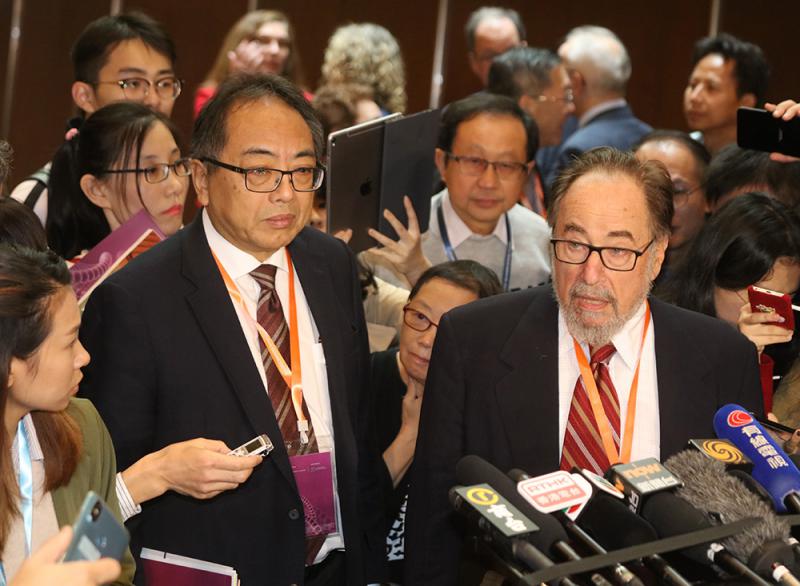 图:港科院院长徐立之(左)及筹委会主席戴维.巴尔的摩均表示不知道贺建奎的演讲内容\大公报记者林少权摄